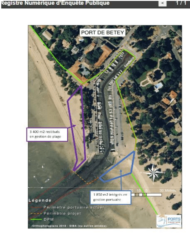« Quant à l’extension de la darse qui avait suscité l’émoi de l’association Le Betey plage boisée à sauvegarder, le syndicat mixte précise qu’un recul de 8,50 m seulement sera fait sur la route, sans conséquence sur l’espace naturel. «